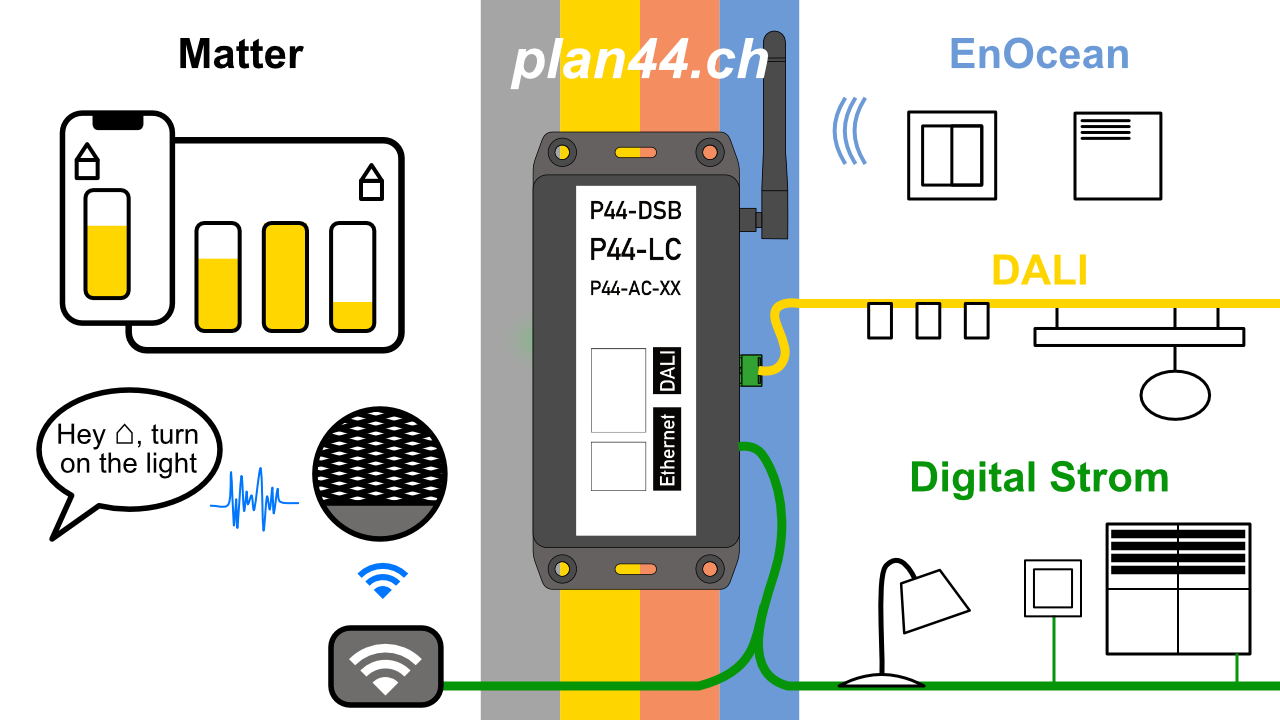 A Digital Strom base installation is not matter-capable itself, but with the matter-Bridge (beta) in the P44-DSB firmware 2.7 it is possible not only to see all DALI luminaires, EnOcean relays etc. directly in matter, but even to make pure Digital Strom room states accessible. More information about matter: plan44.ch/matter.